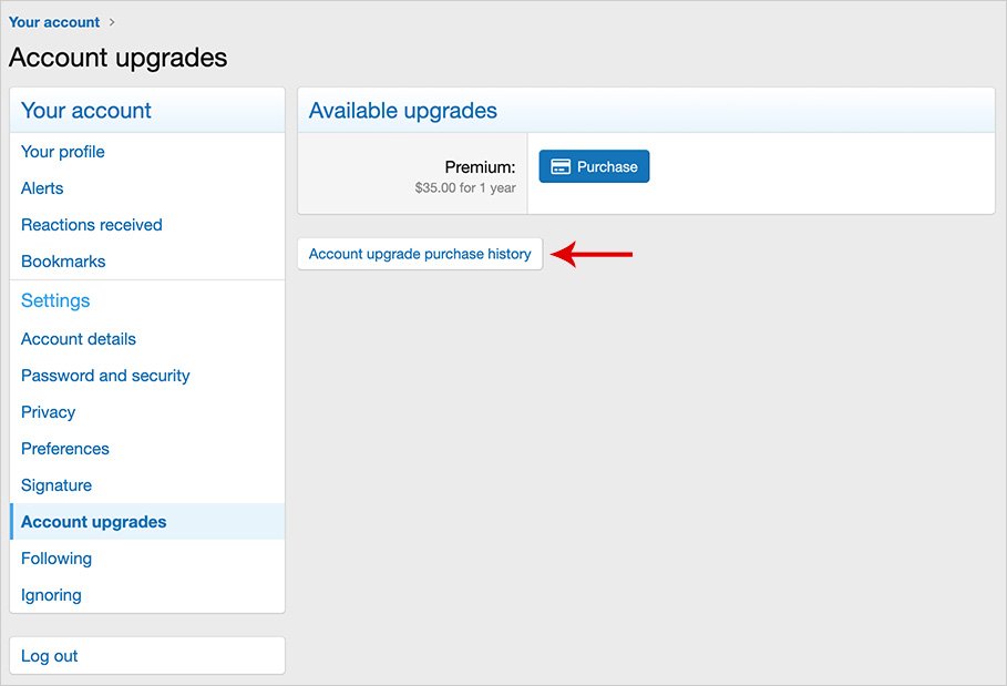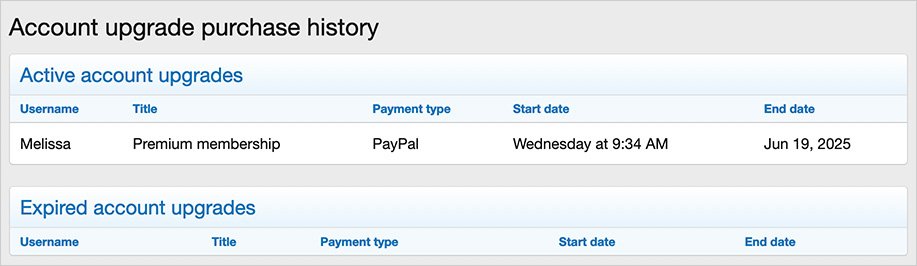 (Example of Account upgrade purchase history link)