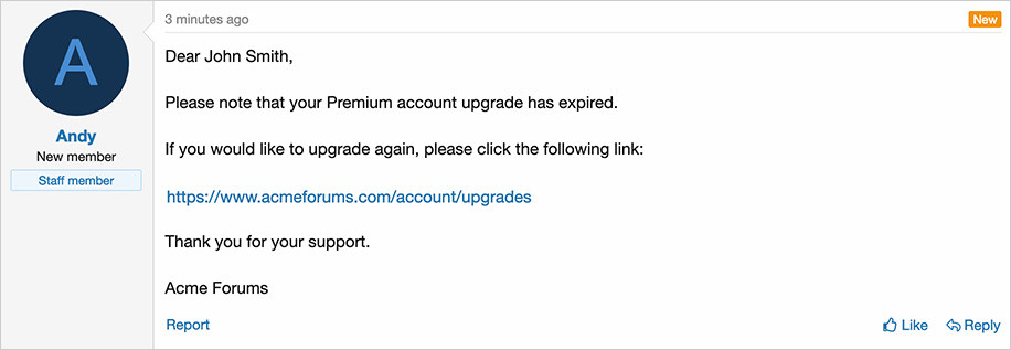 Creates a direct message when a members account upgrade has expired.
