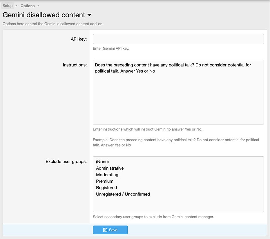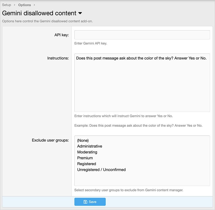 Enter Instruction into the options page. Note that you will want to include "Answer Yes or No" so that the add-on will disallow the post if Gemini AI comes back with Yes.
